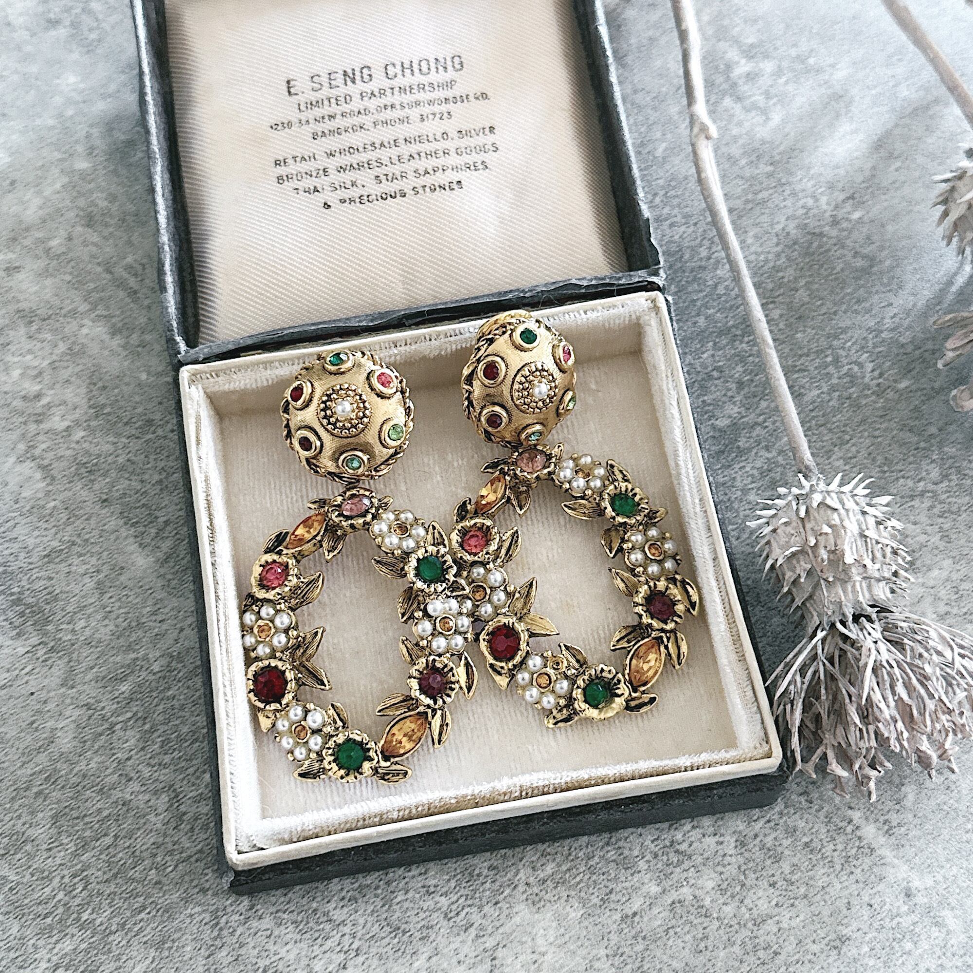 立体的な球状トップに、グリーン・ルビー・アンバーなどのカラフルなストーンがセットされ、下部にはリースのように連なる葉と花のモチーフがあしらわれています。