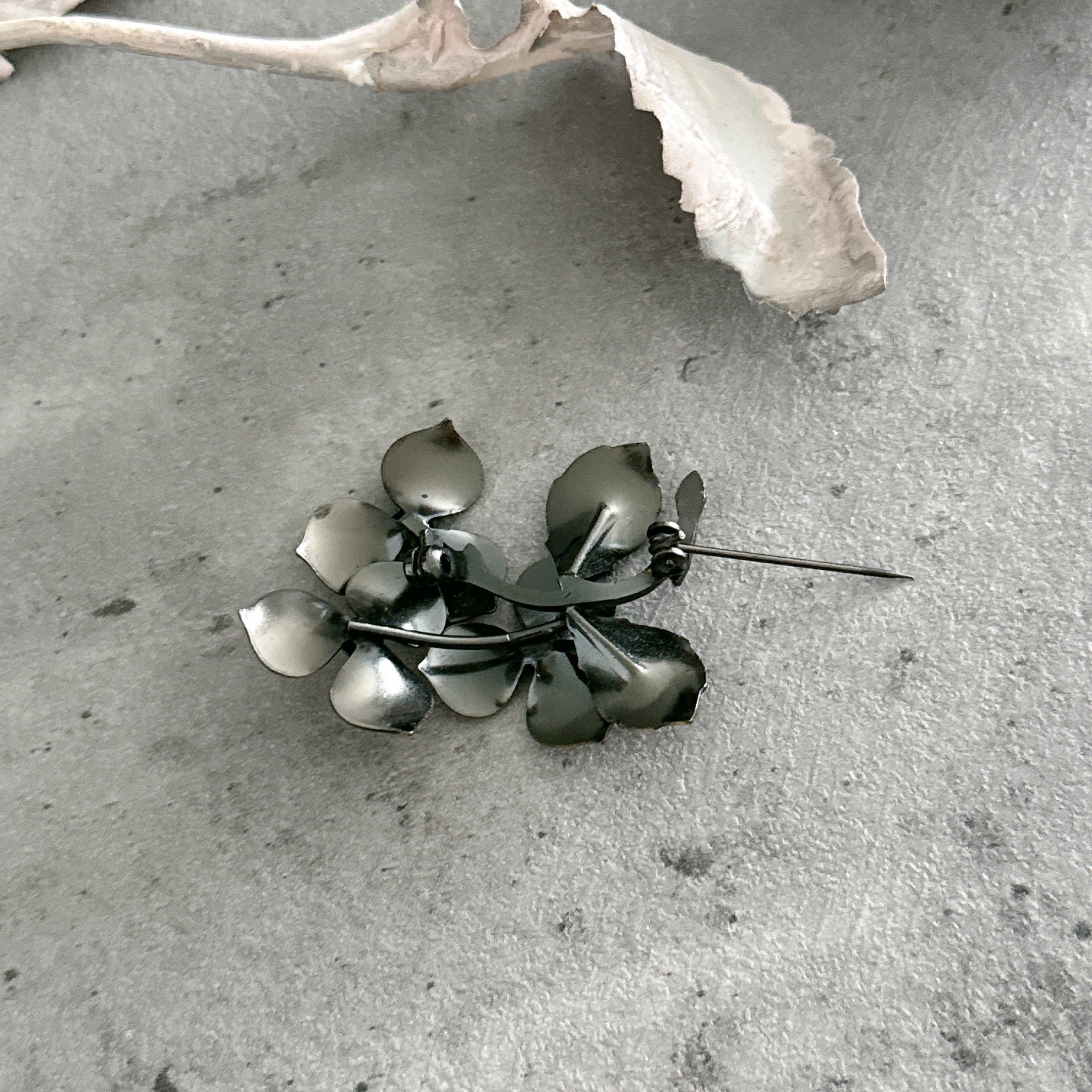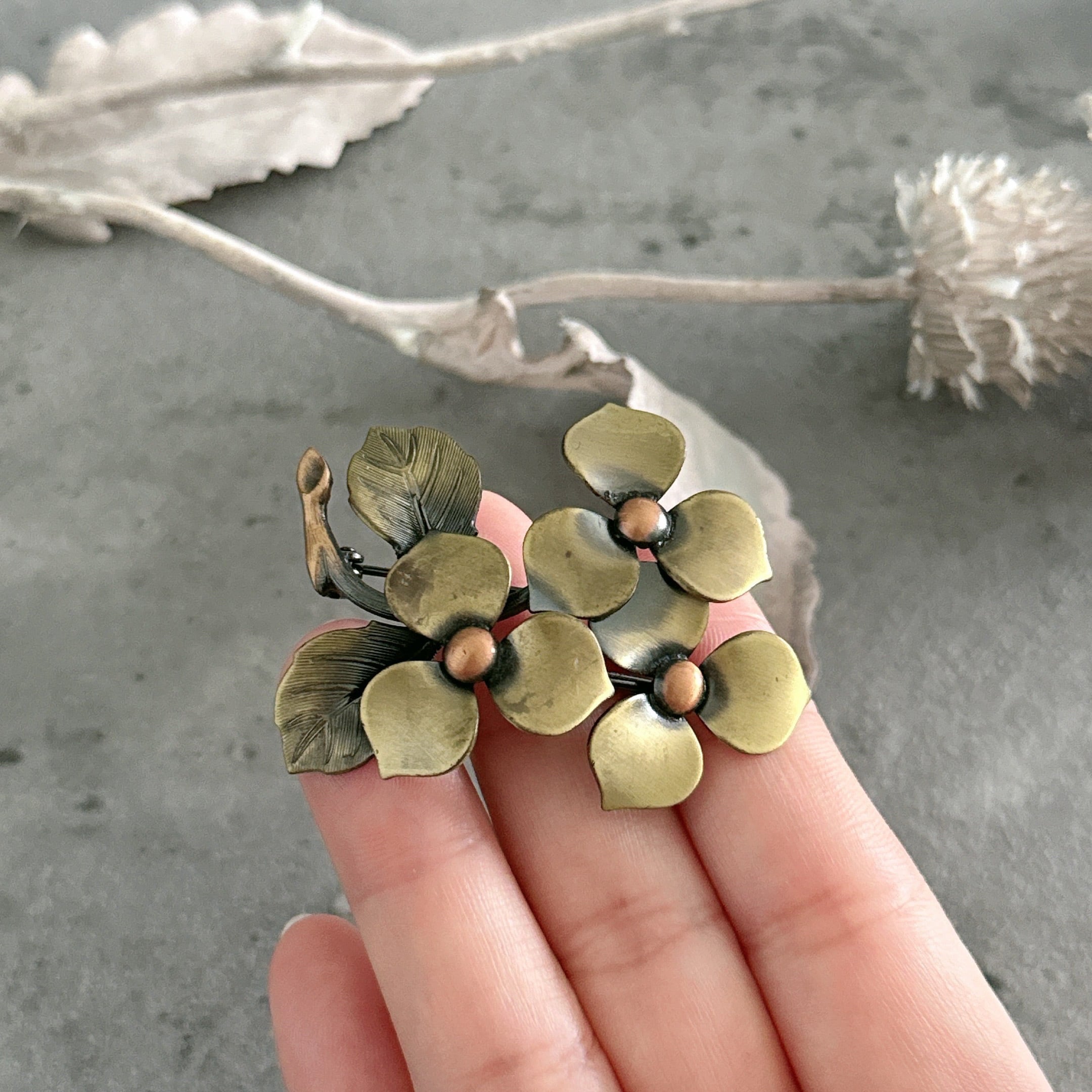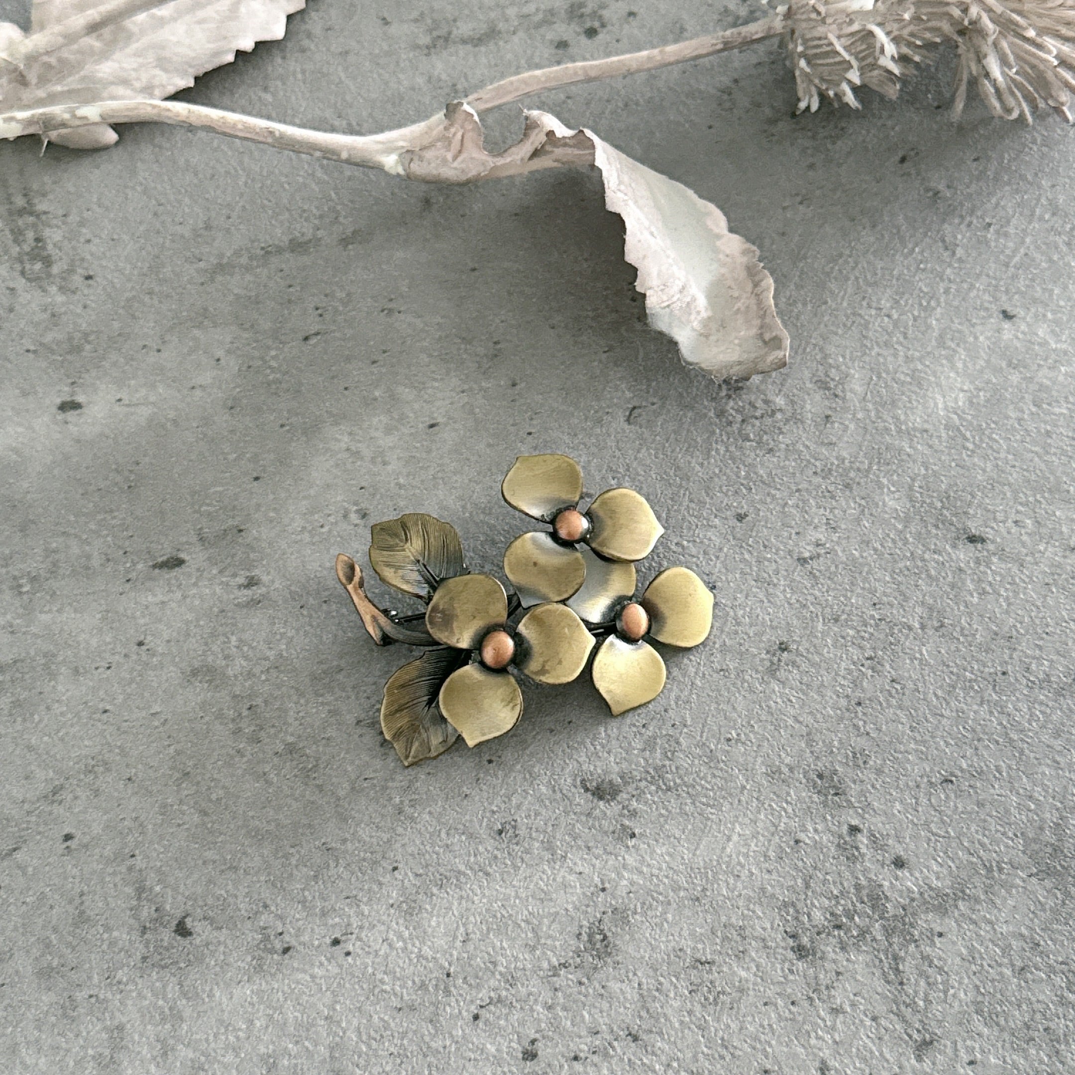 落ち着いた真鍮色(ブラスカラー)の風合いが魅力的なお花のブローチです。