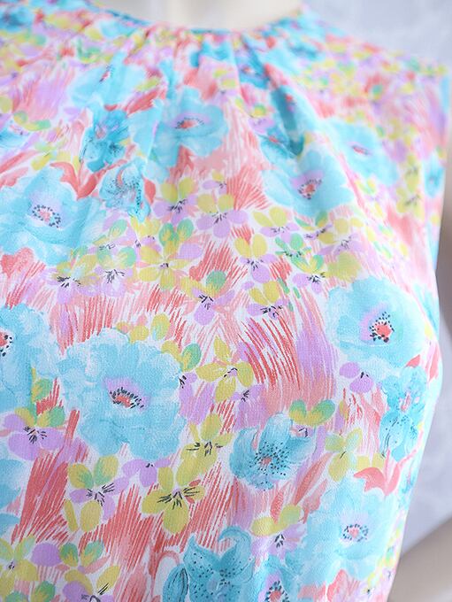 全体が淡い綺麗なカラーで柔らかい雰囲気のワンピースです。日本製のお品です。柔らかい素材でアコーディオンプリーツなので歩くたびに控えめにひらっと広がり綺麗です。様々なパステルカラーのお花柄がレトロな雰囲気を醸し出しています。同じ色合いやホワイトカラーの小物を合わせていただくと統一感が出て素敵です。