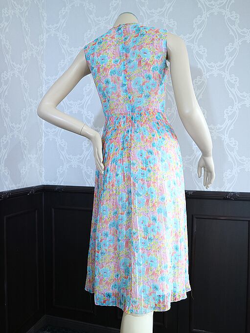 ヴィンテージワンピース / 日本製花柄アコーディオンプリーツ水色ノースリーブワンピース jv-op-1002
