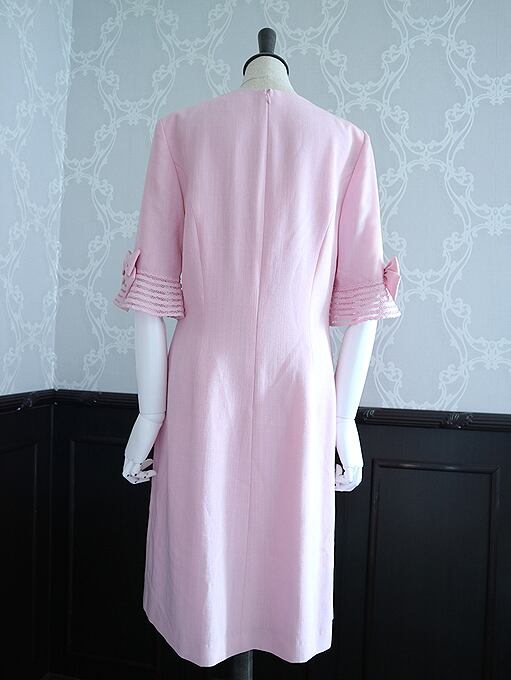 ヴィンテージワンピース / 日本製ピンク五分袖リボンフリルワンピース jv-op-1003