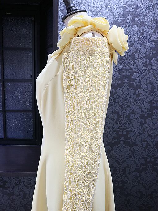 ヴィンテージドレス / 日本製花モチーフ袖総レースイエロー長袖オフショルダーフレアドレス jv-dress-1005
