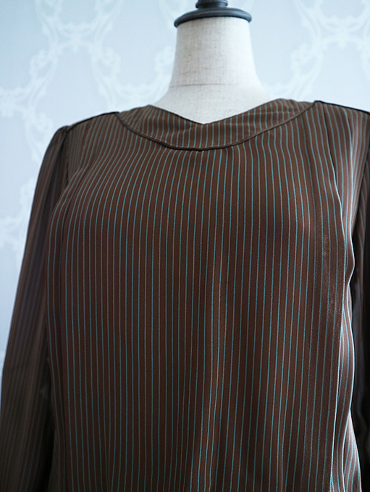 シックなブラウン系ヴィンテージワンピースです。ブラウンとグリーンのピンストライプです。