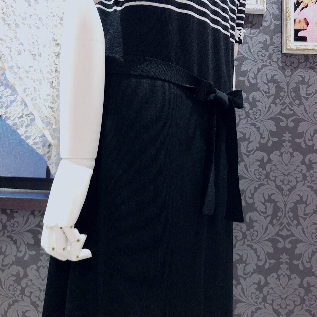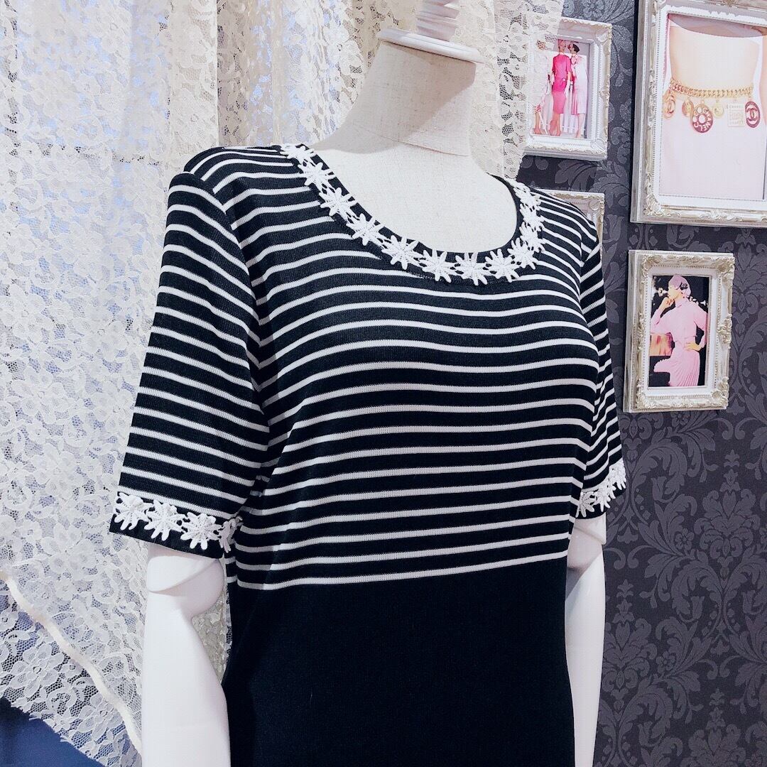 フラワーモチーフとボーダーの組み合わせがありそうでなく、コンサバティブな雰囲気もある上品なワンピースです。ニット素材がとても上質でさらっとした着心地です。ボーダーと無地の切り替えが高めなのでスタイルが良く見えそうです。