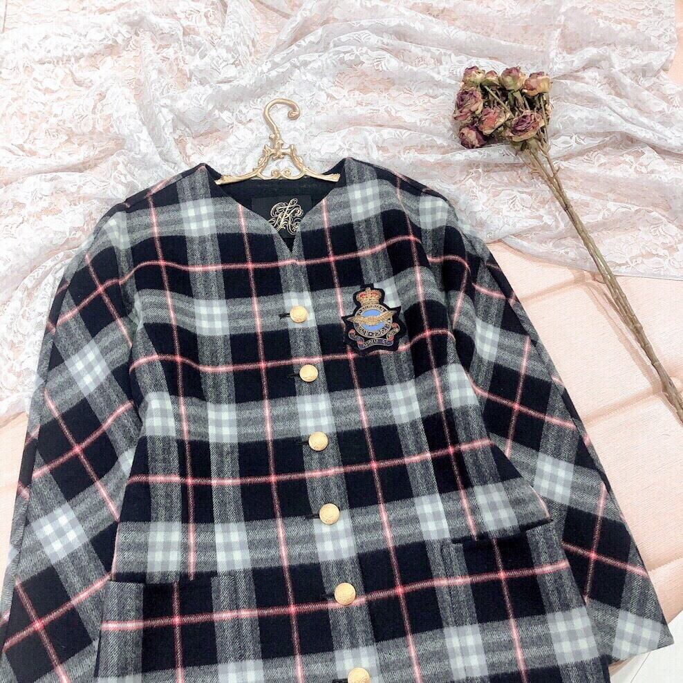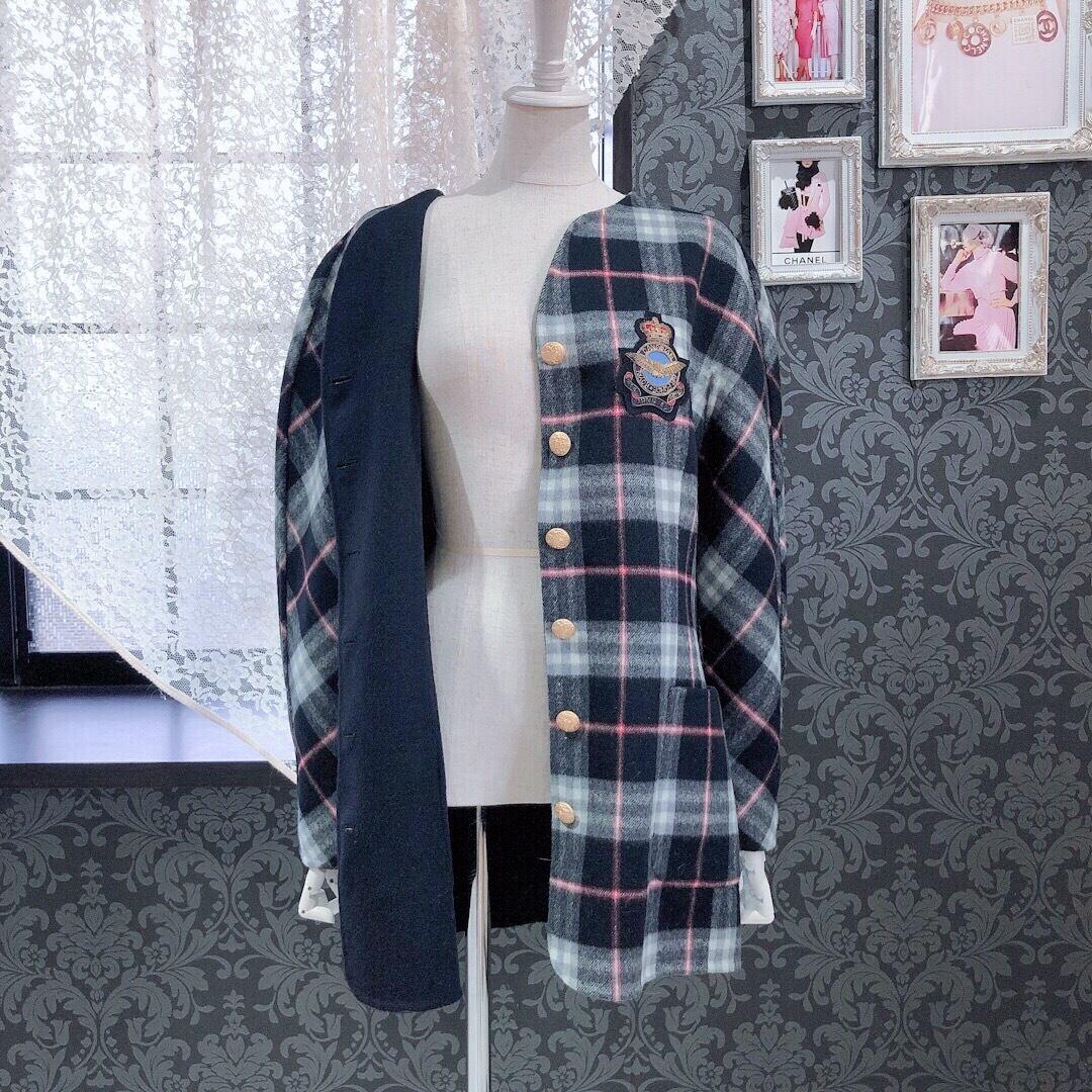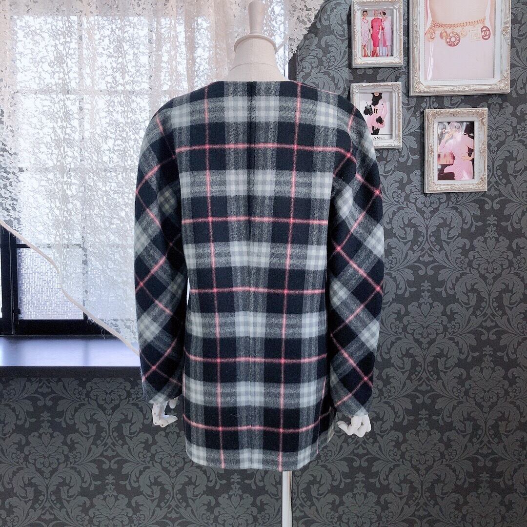 < 伊太利屋 > イタリヤ チェック柄ノーカラーウールヴィンテージコート