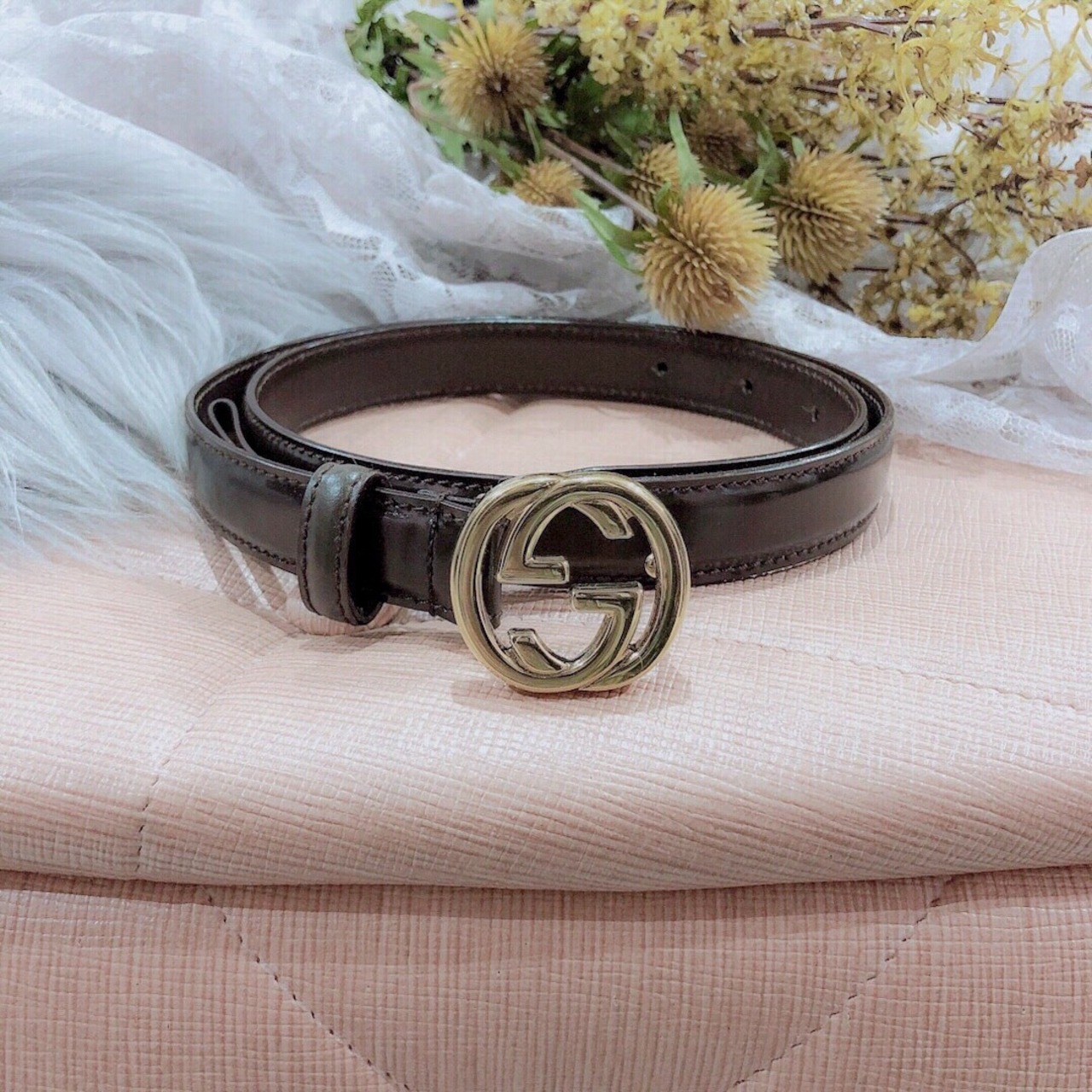 GUCCIのイタリア製ブラウンベルトです。光沢感のあるガラスレザーで、ベルトの幅が細身になりますので女性らしいデザインです。小さめのダブルGのバックルはさりげなくアクセントになります。