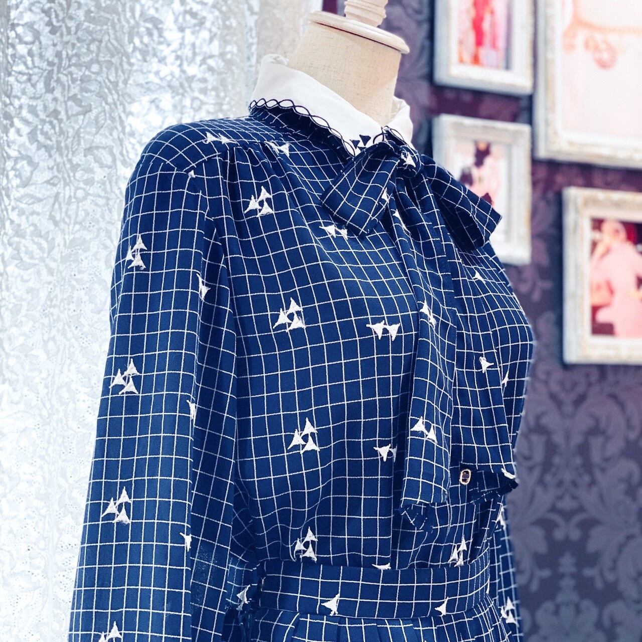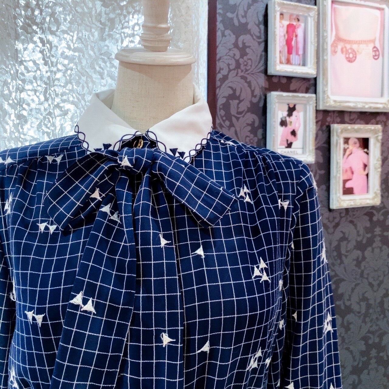 清楚なセットアップになります。もちろん単品でもお使いいただけます。グラフチェックに三角の刺繍がレトロな雰囲気を醸し出しています。リボンは取り外し可能でまた雰囲気が変わります。スカートはプリーツスカートでより品の良いセットアップとなっております。ホワイトカラーの襟は取り外せません。取り外したい場合は糸で縫い付けてあるだけなので可能です。