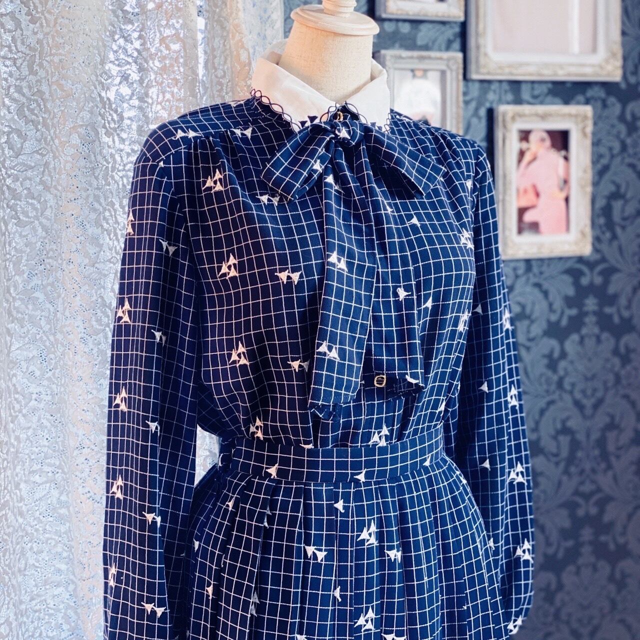 < ヴィンテージセットアップ > 日本製ネイビーグラフチェック刺繍ブラウス&スカート