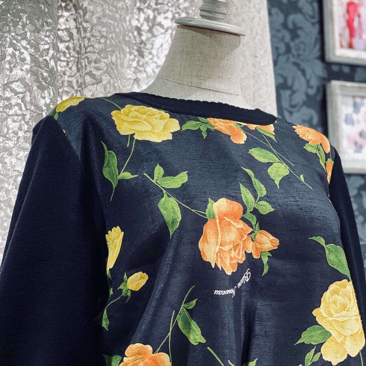 前見頃は光沢感のある薔薇のプリント生地が施されています。こちらのプリント生地はマットな生地なのですが光に当たると僅かに艶っぽくなります。全体的に大人っぽいセーターです。ブラックやオレンジ、イエローのボトムスがおすすめです。