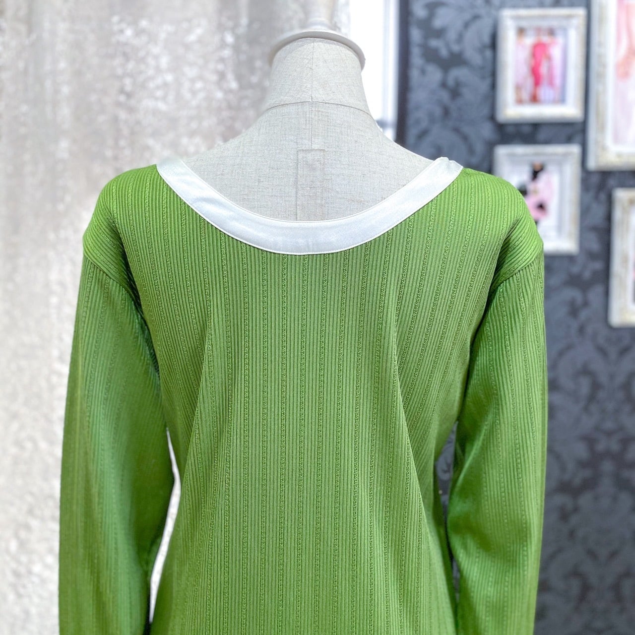 ワコール社のお品でカットソー生地はとてもしっかりしていていい生地だと一目で分かります。落ち着いた黄緑色とオフホワイトのパイピングの組み合わせは大変珍しくレトロっぽい印象です。ストレッチが効いているので楽チンで1枚でストンと着ても決まるので重宝すると思います。
