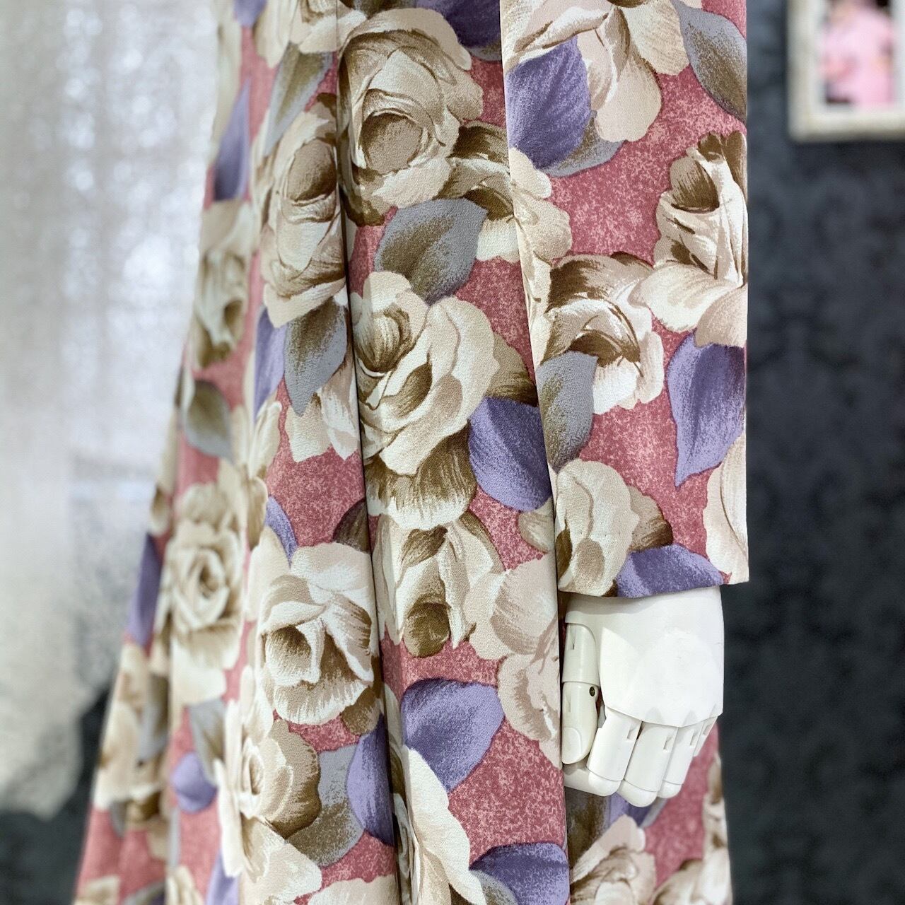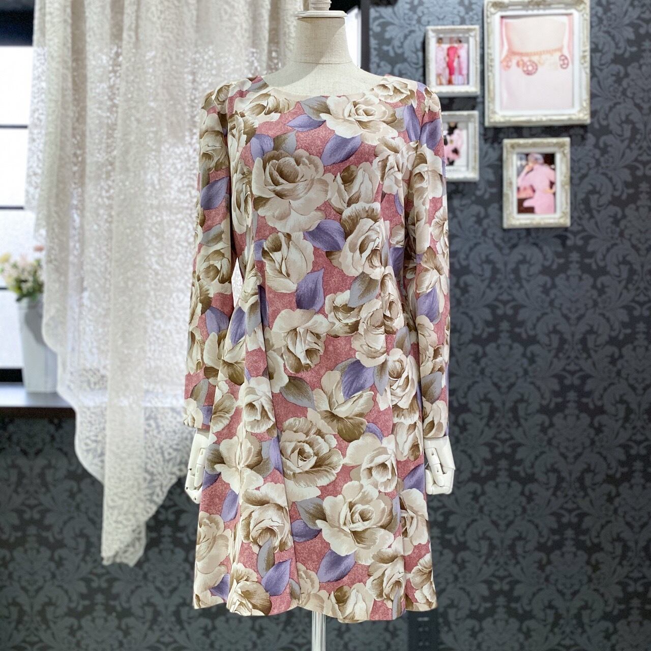くすんだピンクとベージュの色の組み合わせがレトロでロマンティックです。フェミニンというよりは女性らしいエレガントな雰囲気のワンピースです。肩幅が少し大きめなのでなで肩の方には合わせづらいと思われます。靴や小物はベージュ系で合わせていただくと大人っぽくスタイリングができます。