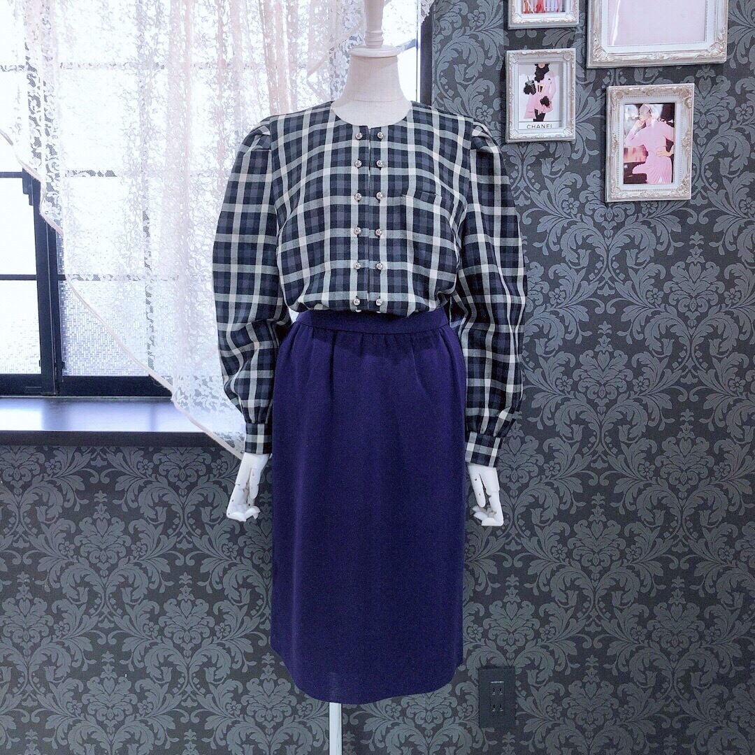 ヴィンテージブラウス / 日本製ブルー系チェックダブルボタンノーカラーブラウス