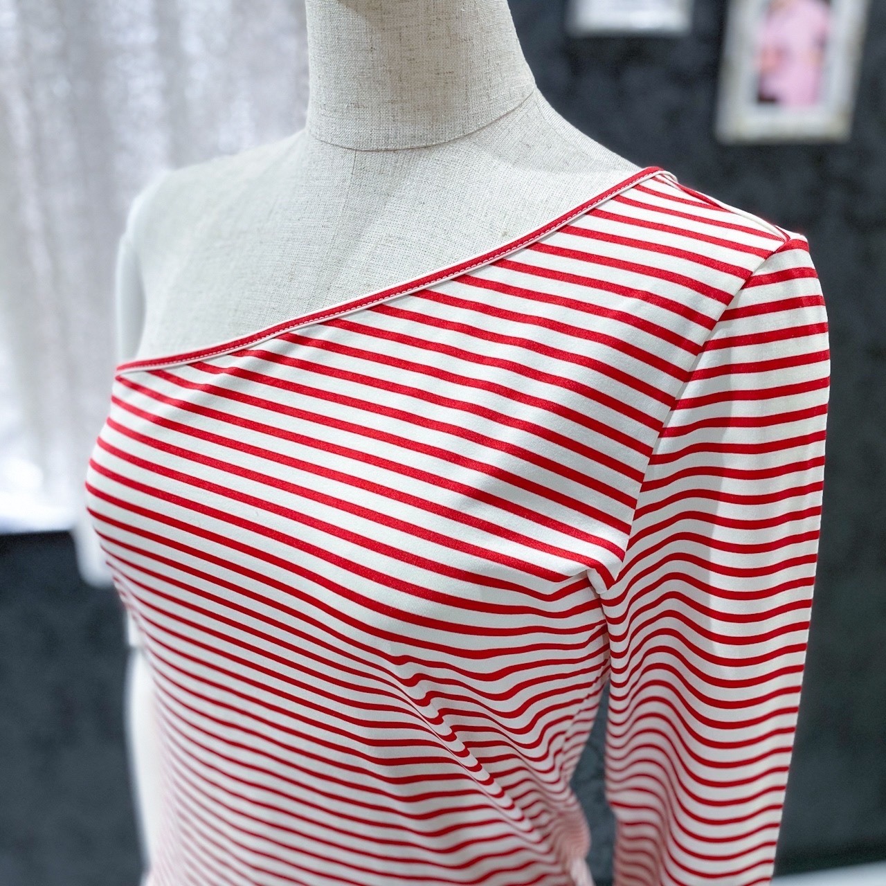 シャルルジョルダンのワンショルダーTシャツです。コットンTシャツではなくストレッチのきいたつるつるした素材のTシャツになりますので大人っぽいです。おすすめはフレンチスタイル。ワンショルダーなので差をつけることができます。