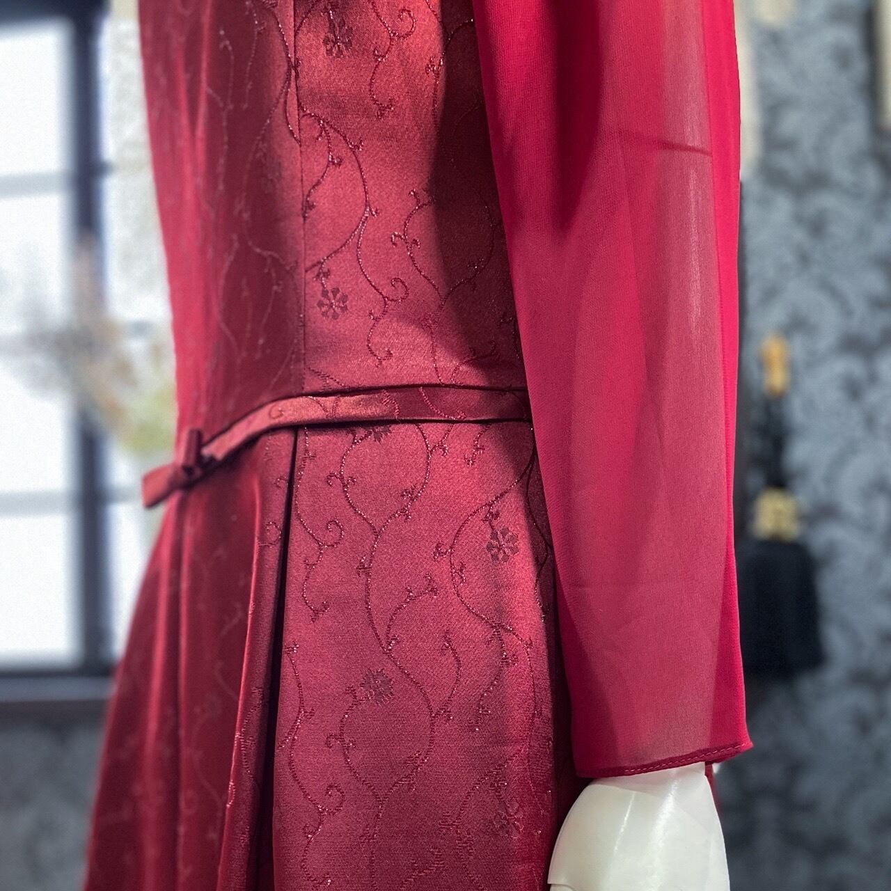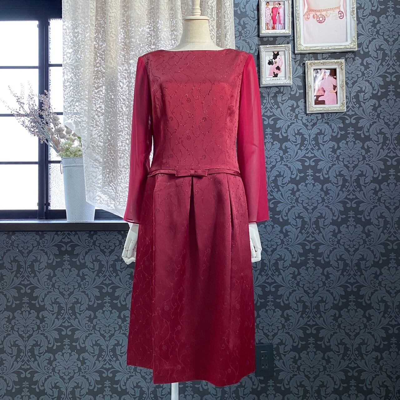 東京ソワール社製のワンピースです。ウエストの切り替えが低めなのでよりクラシカルなデザインです。袖シースルーは今年大注目なのでおすすめです。エンボスフラワーはラメ仕様です。ボルドーカラーなので落ち着いていますし、上品なワンピースです。