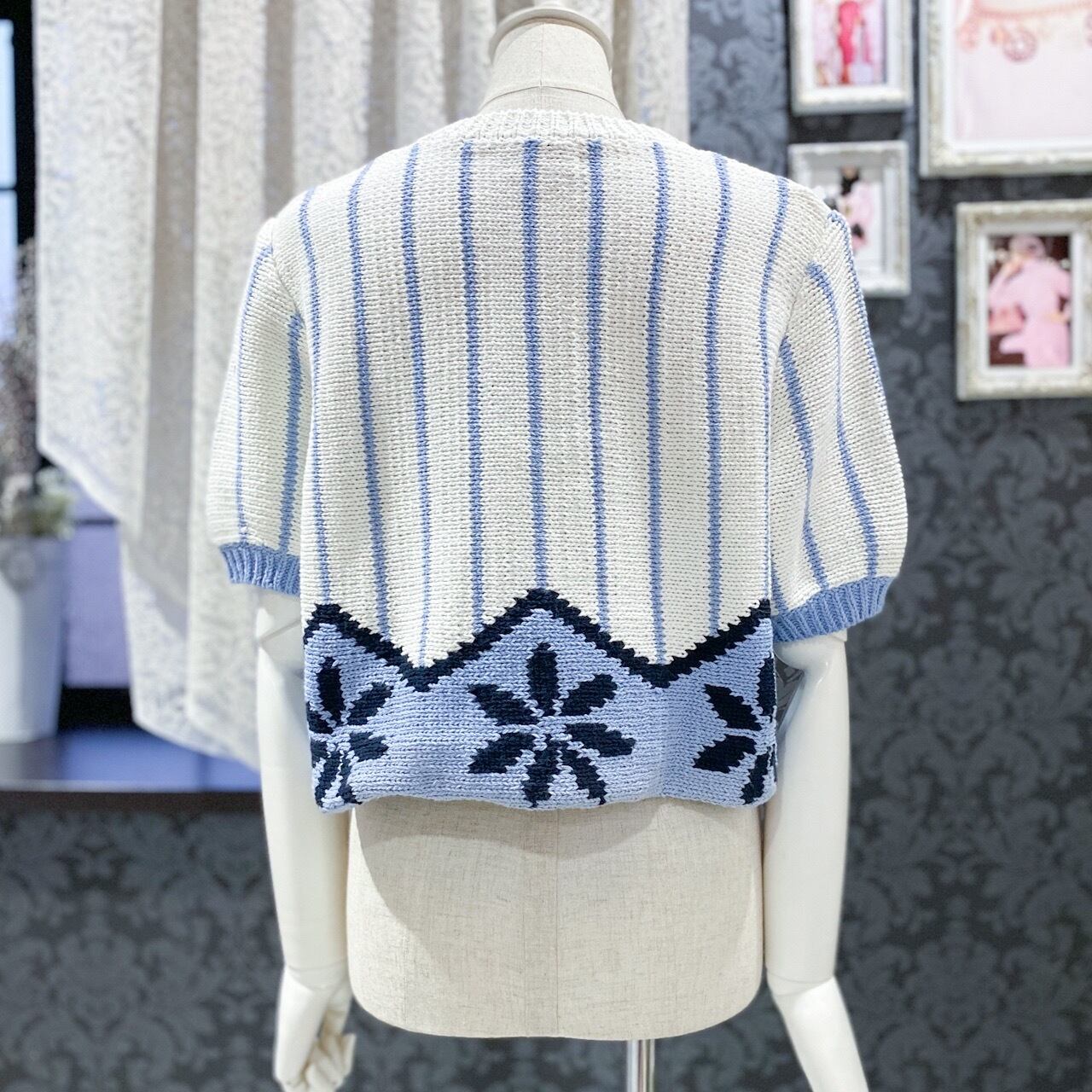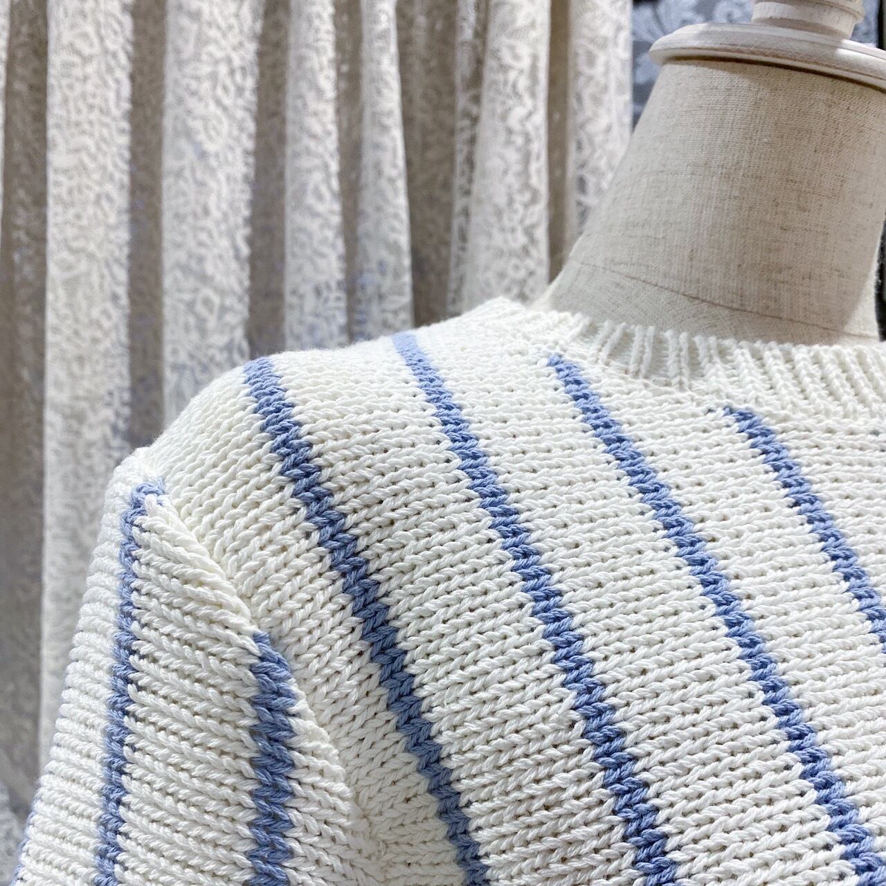 JUST BIGIのざっくりとしたサマーニットです。オフホワイトと水色の組み合わせはとても爽やかでホワイトコーデも可能です。身幅が少し大きめになりますので、少しゆったりとしていて今っぽいシルエットです。またショート丈なのでボトムスとのバランスが取りやすいと思います。