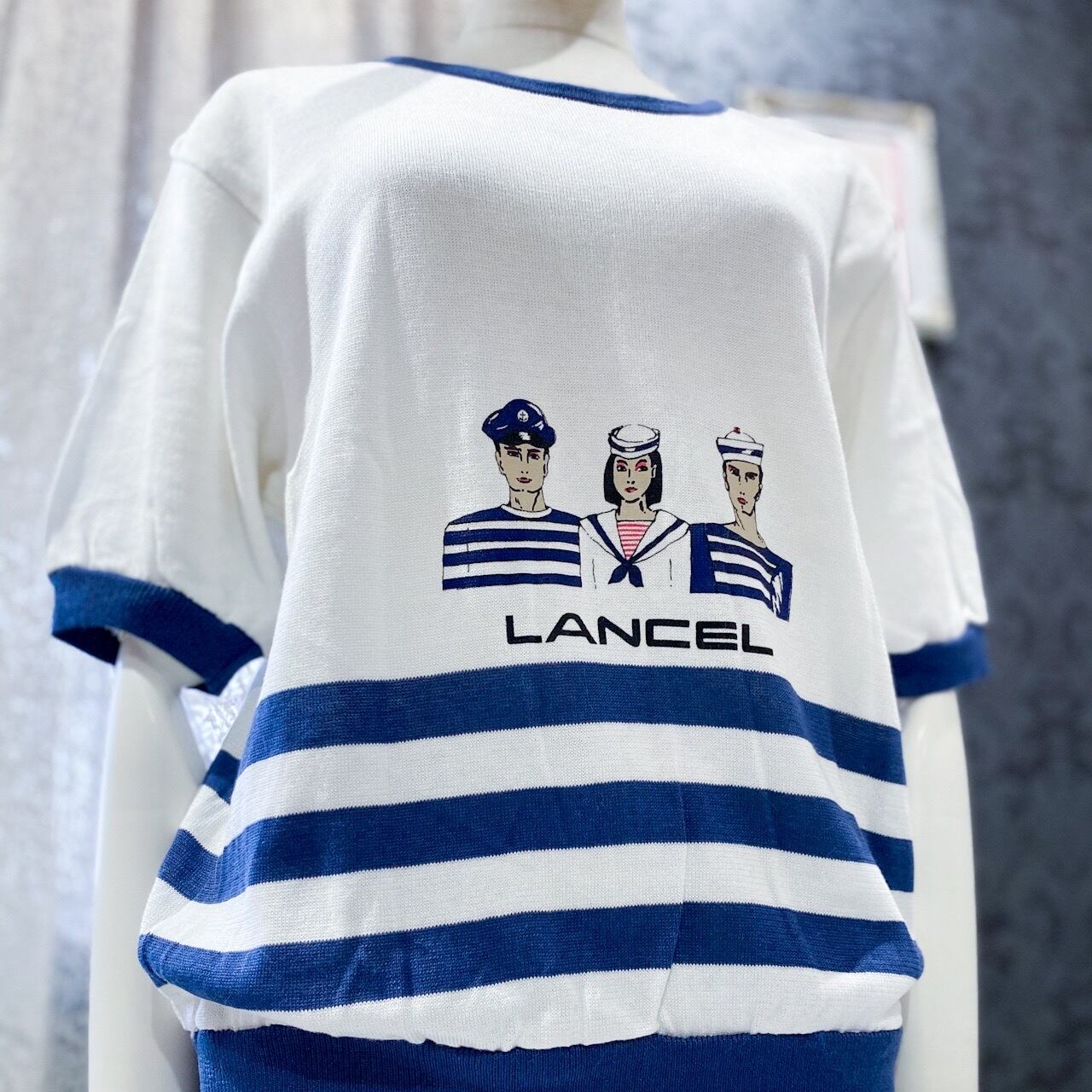 LANCELのサマーニットです。80年風のイラストにビッグシルエットでレトロな印象。ライセンス商品になり日本で製造されたものになり正規品です。爽やかな印象になりますのでこれからの季節に最適です。ネイビーのボーダーは濃い目のネイビーになります。