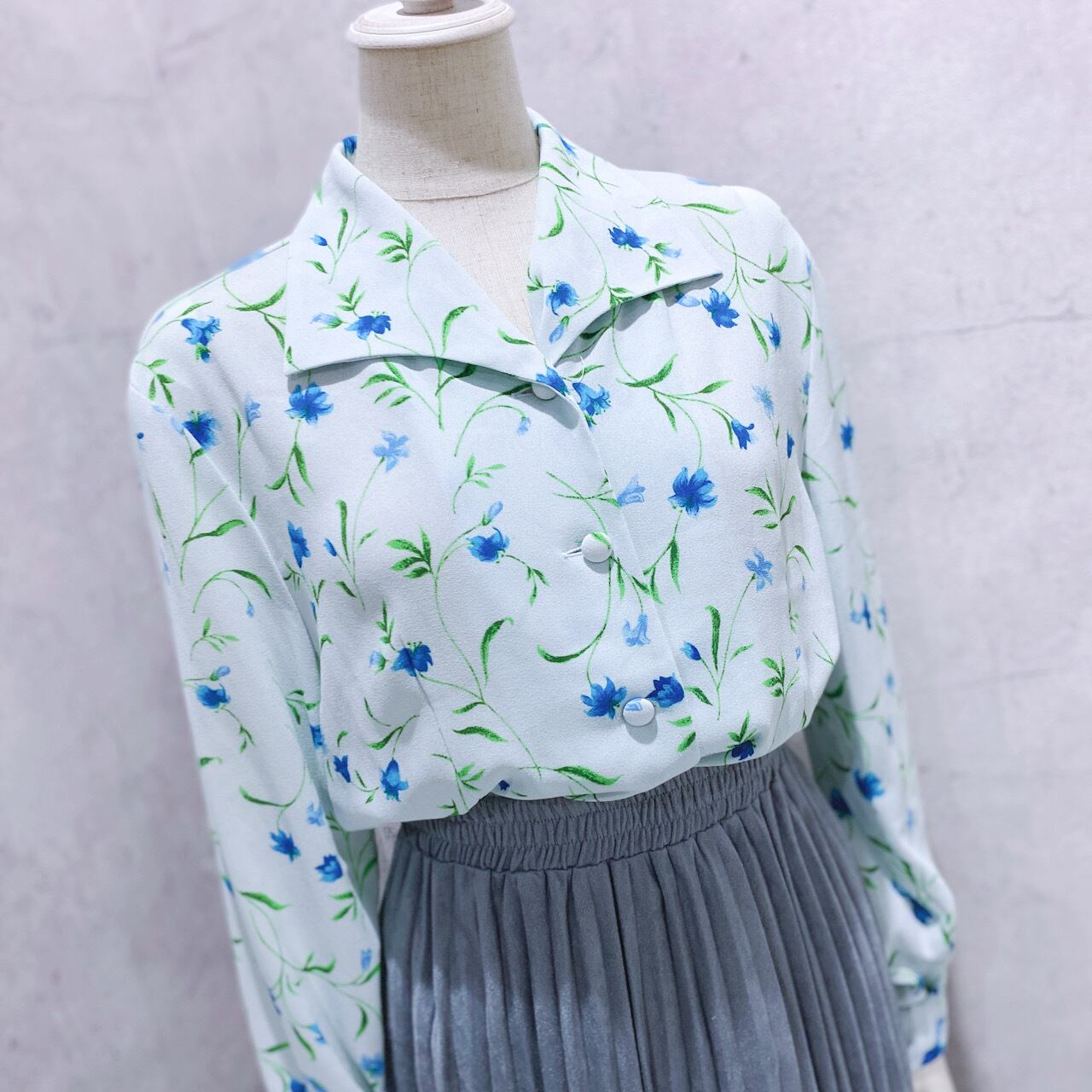 日本製ヴィンテージ水色花柄上品長袖ブラウス