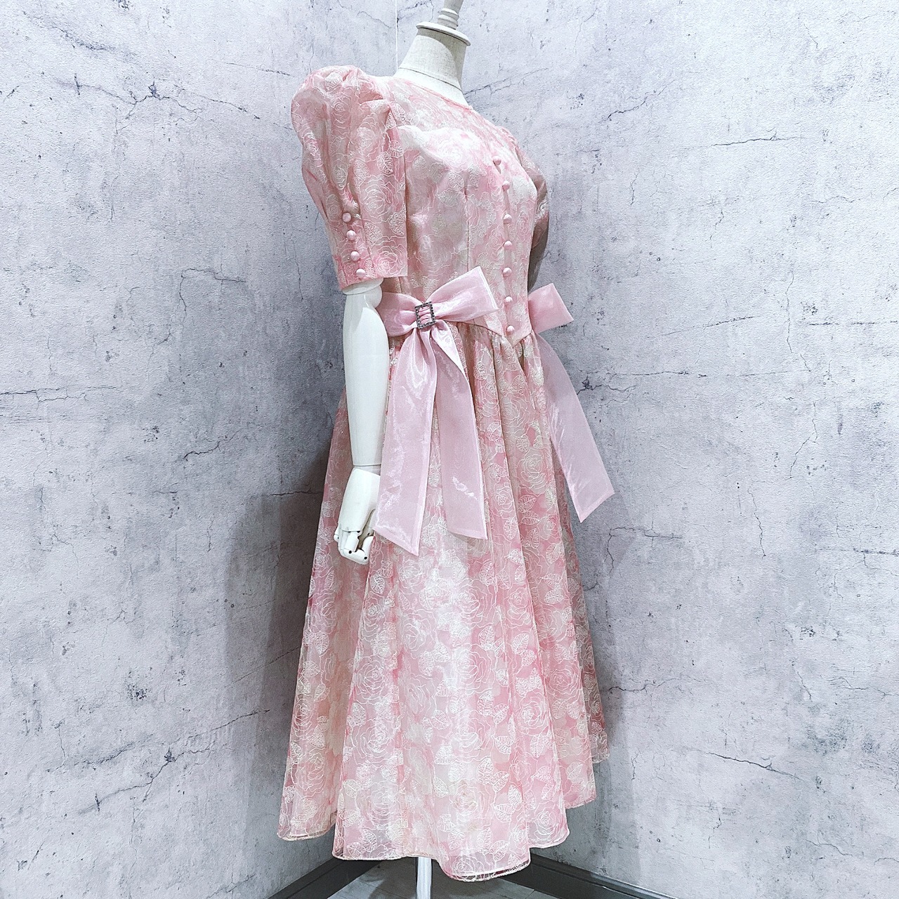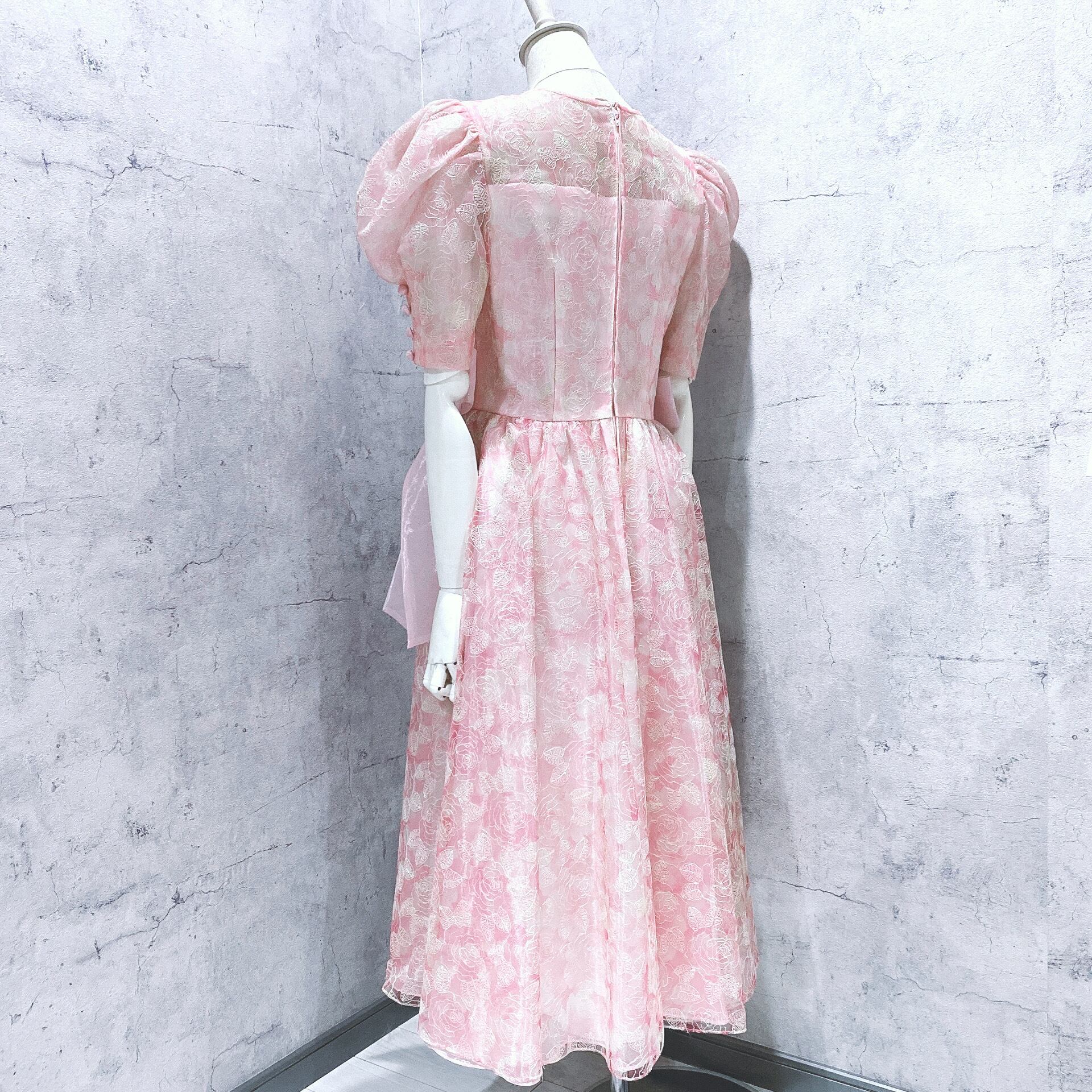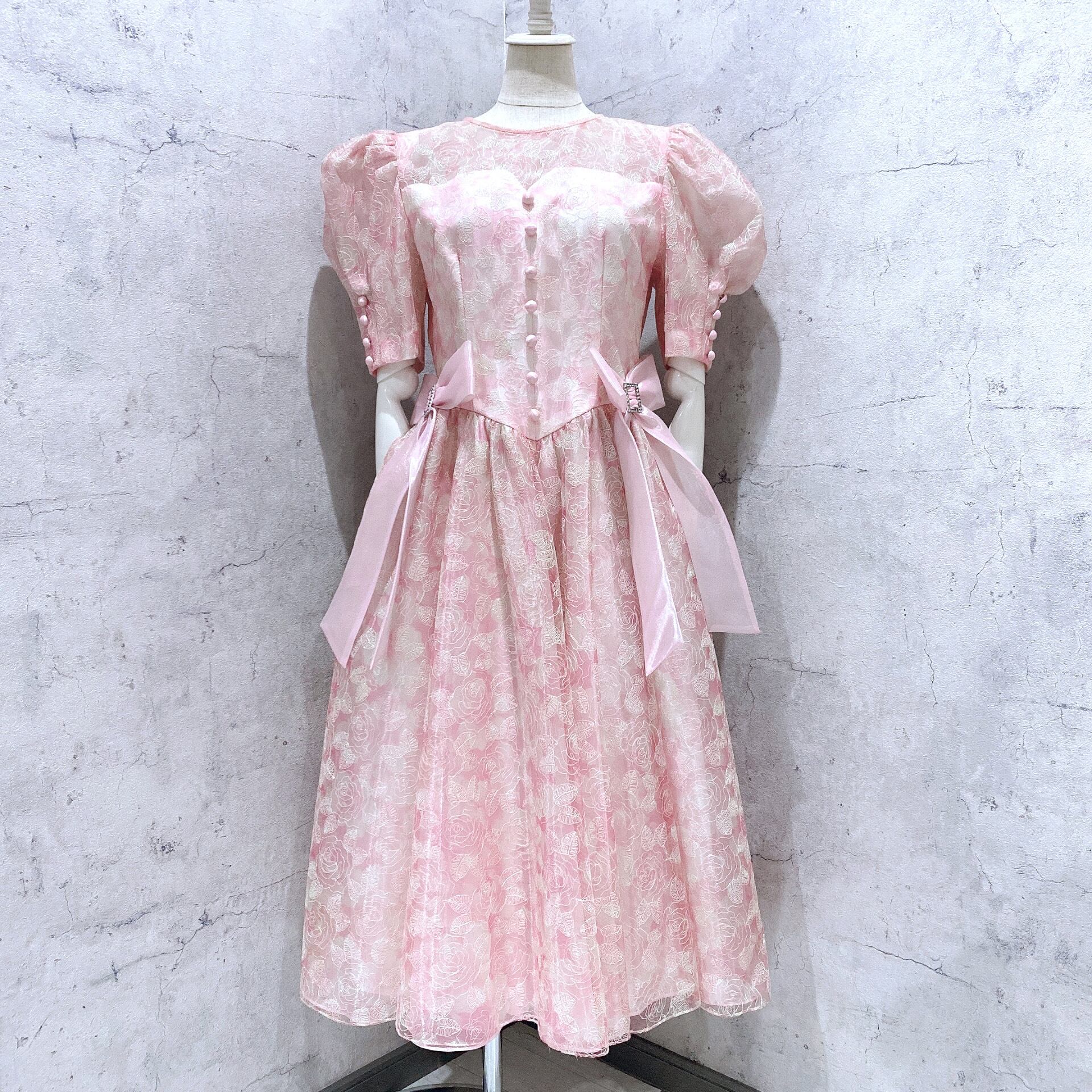ヴィンテージドレス 日本製ピンク総レースリボンパフスリーブドレス