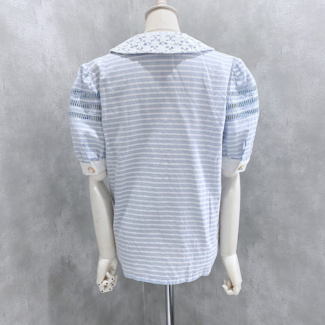 ◾️Type / フラワーモチーフ刺繍襟、パールボタン、パフスリーブ、ボーダーとかなりディテールの凝ったブラウスです。また柔らかい色合いでフェミニンの中にも品があります。
