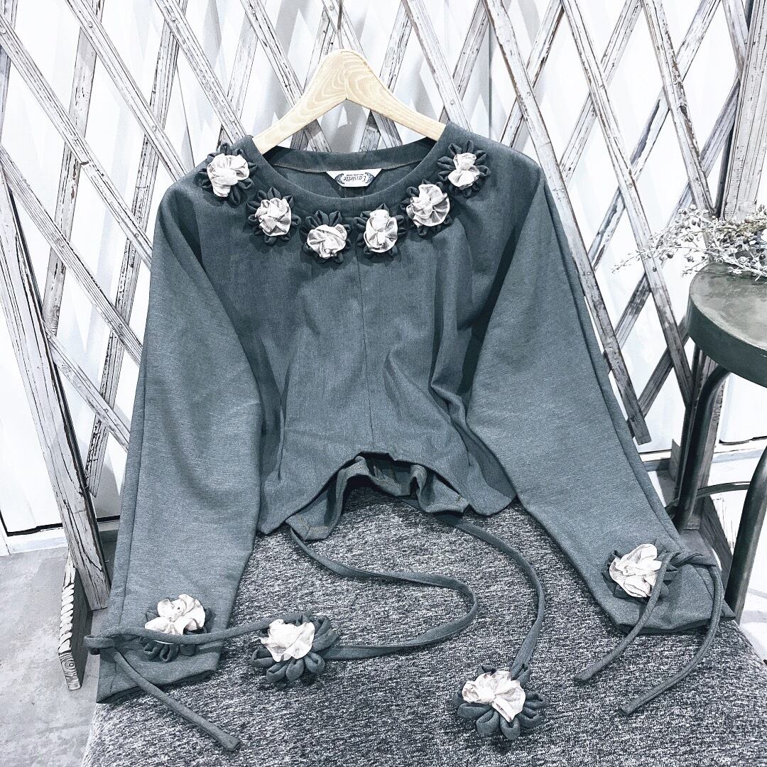 モードっぽいシルエットに可愛いフラワーモチーフがついているアンバランスさがおしゃれなトップスです。