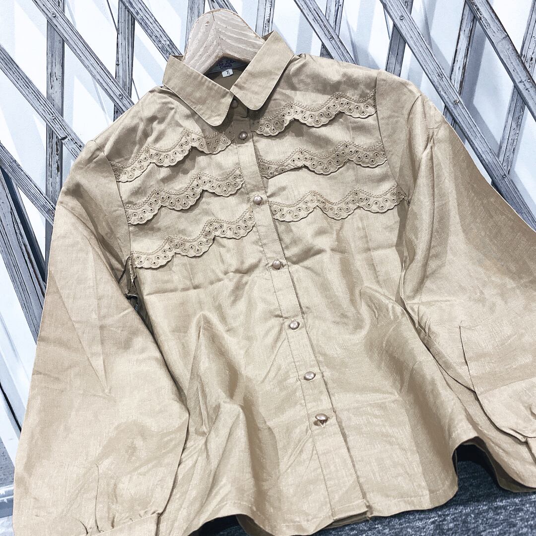 ヴィンテージブラウス / イトキン日本製ブラウンスカラップフリル×刺繍×丸襟長袖ブラウス