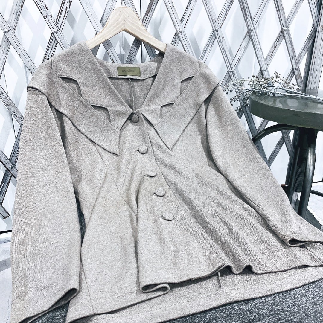 カットアウトされた大きな襟が特徴のストレッチ製のあるカーディガンです。