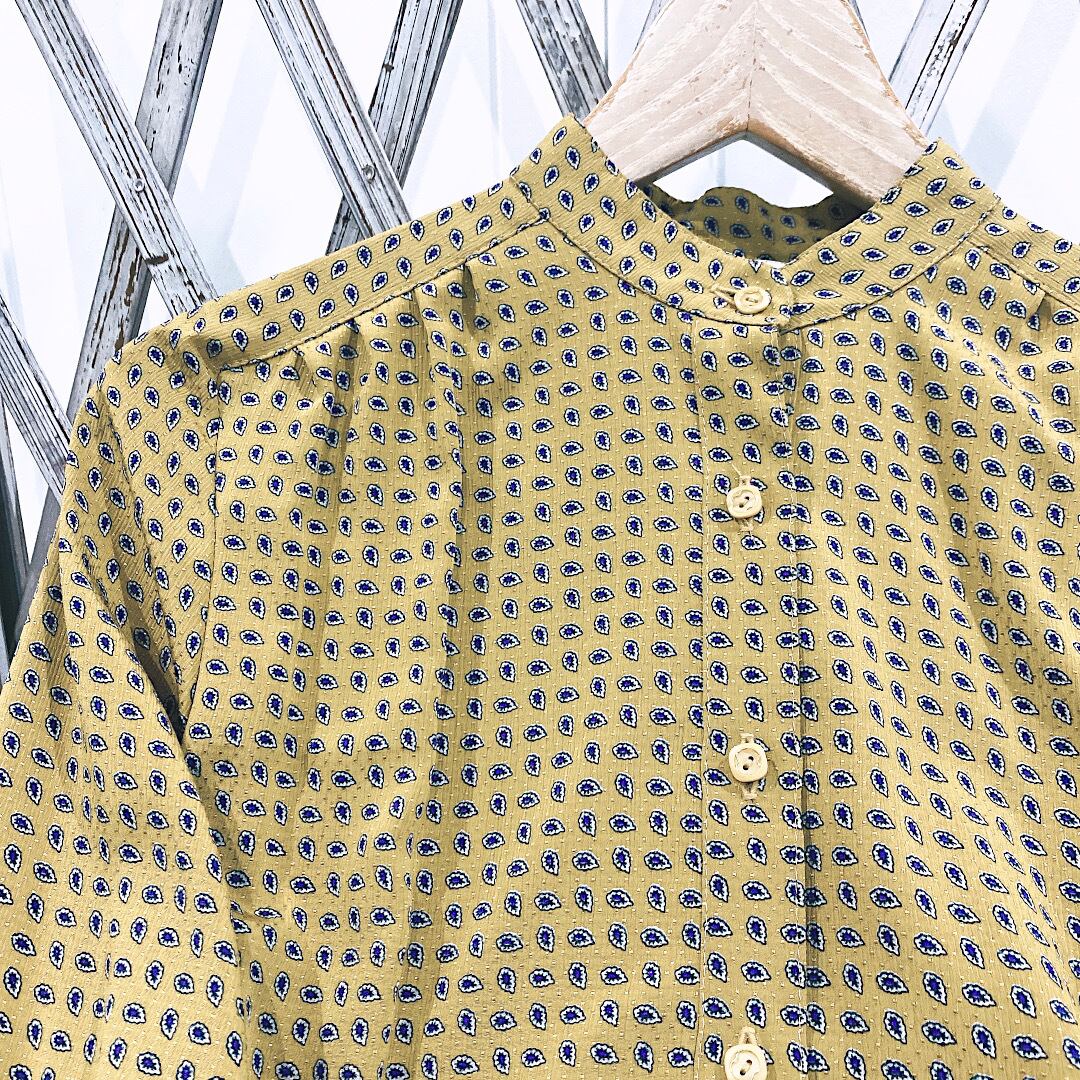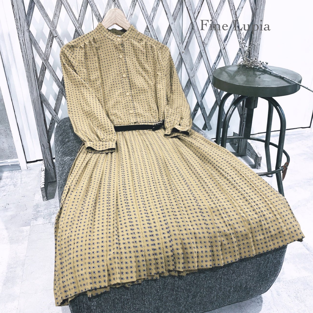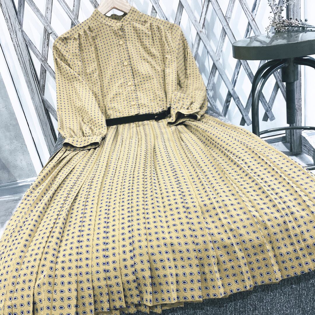ヴィンテージワンピース / 日本製マスタードイエローペイズリーバンドカラー長袖プリーツワンピース
