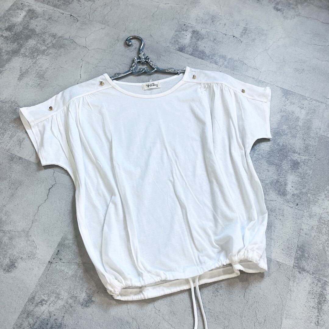 一見シンプルなTシャツですが、フレンチスリーブとドローコードのレトロな組み合わせと、ゴールドのプチボタンが肩に付いていてかなり凝ったデザインです。