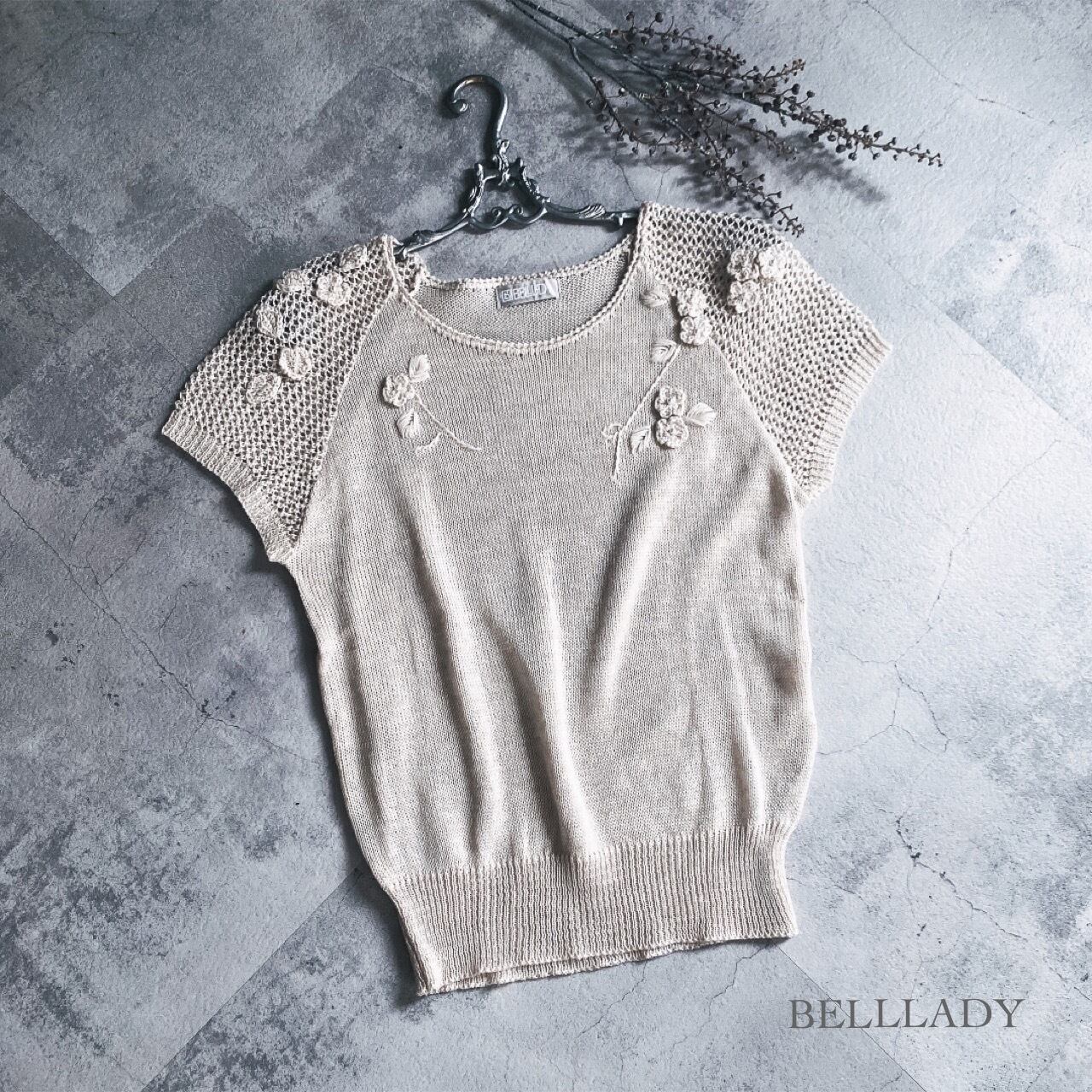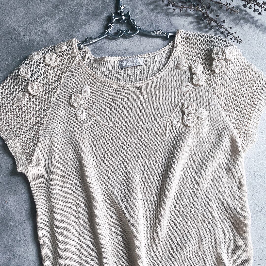 日本製ベージュフラワーモチーフフレンチスリーブヴィンテージニット