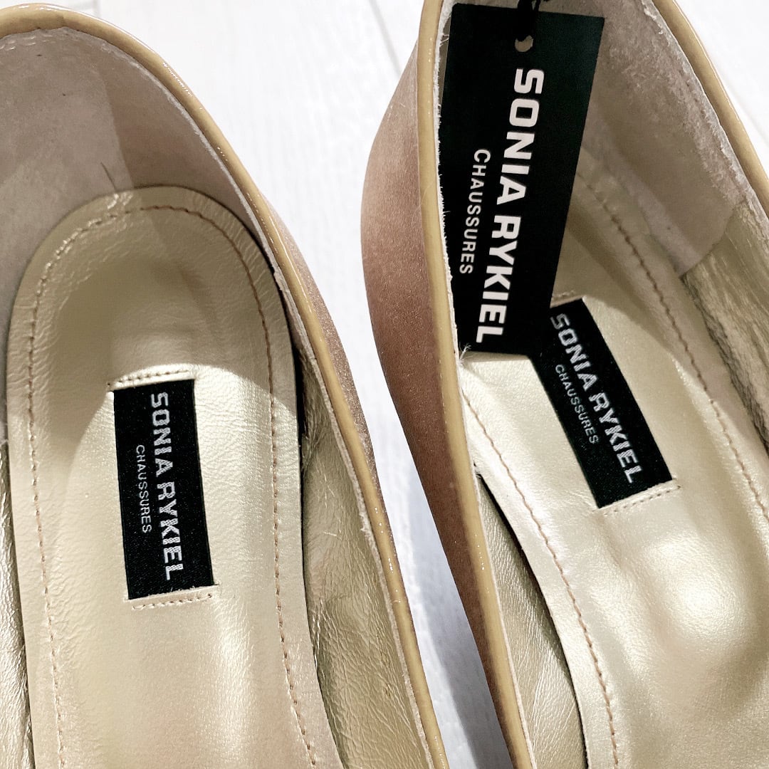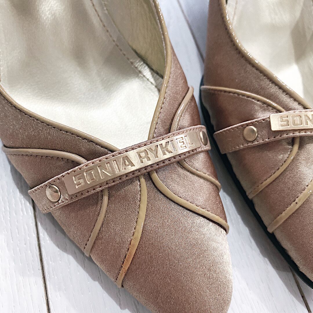ソニアリキエルのブロンズのような落ち着いたゴールドカラーとマットゴールドのロゴプレートが大人っぽいパンプスです。
