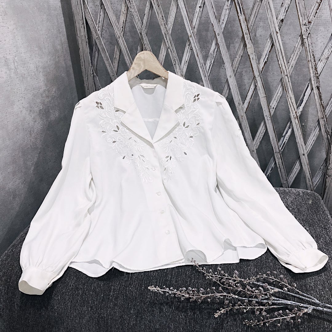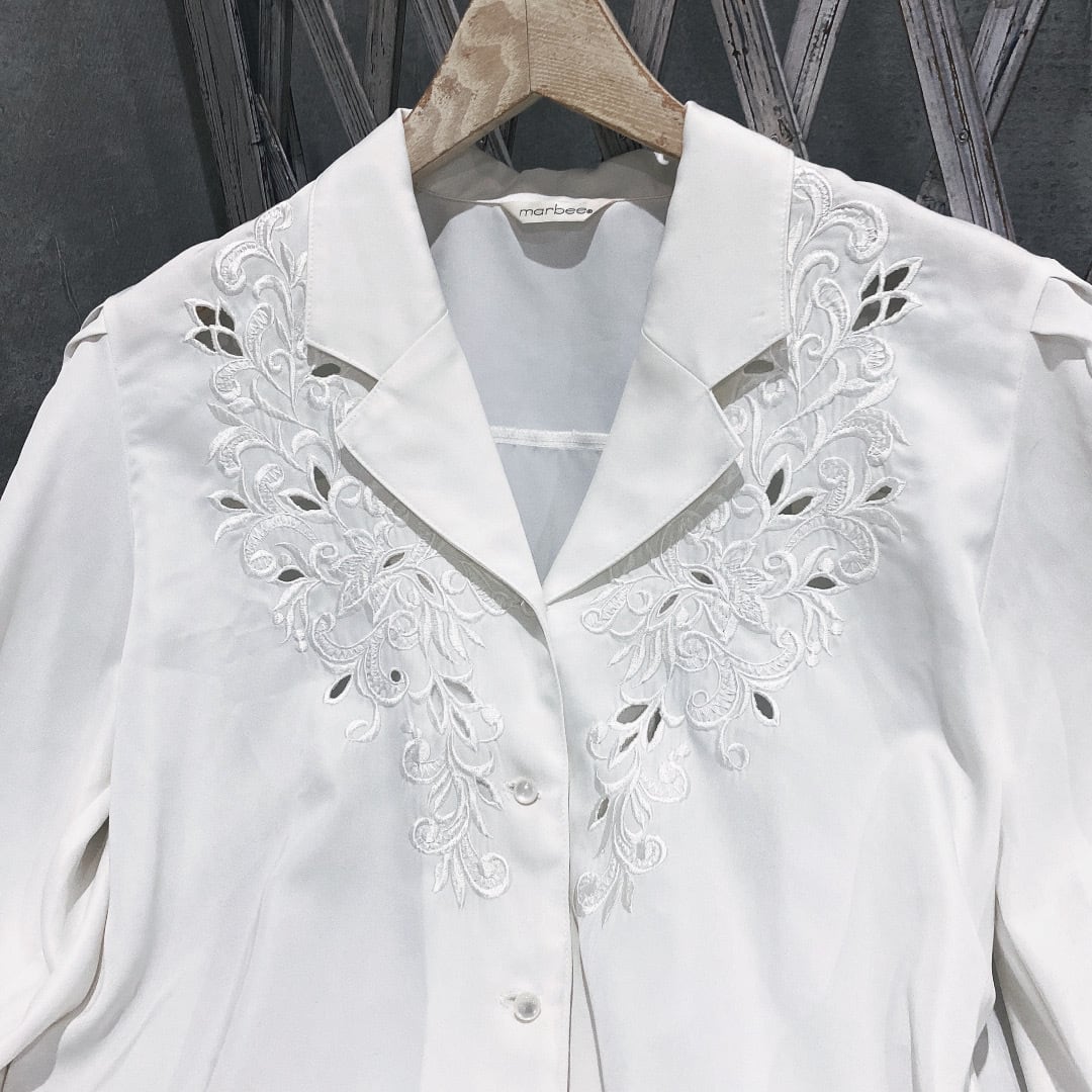 日本製オフホワイトカットアウト花刺繍オープンカラー長袖ヴィンテージブラウス