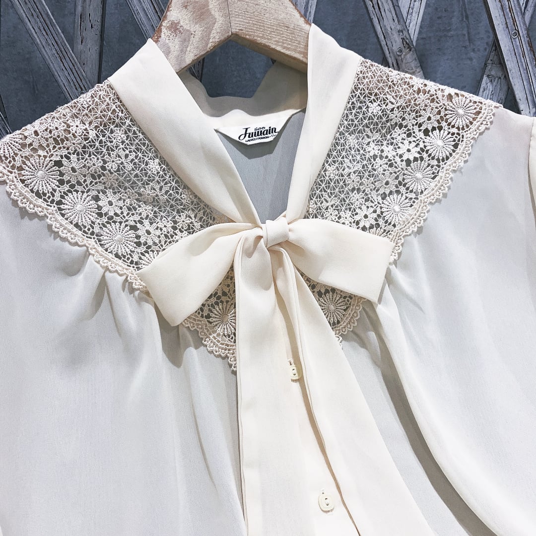 日本製エクリュボウタイ×刺繍長袖ヴィンテージブラウス