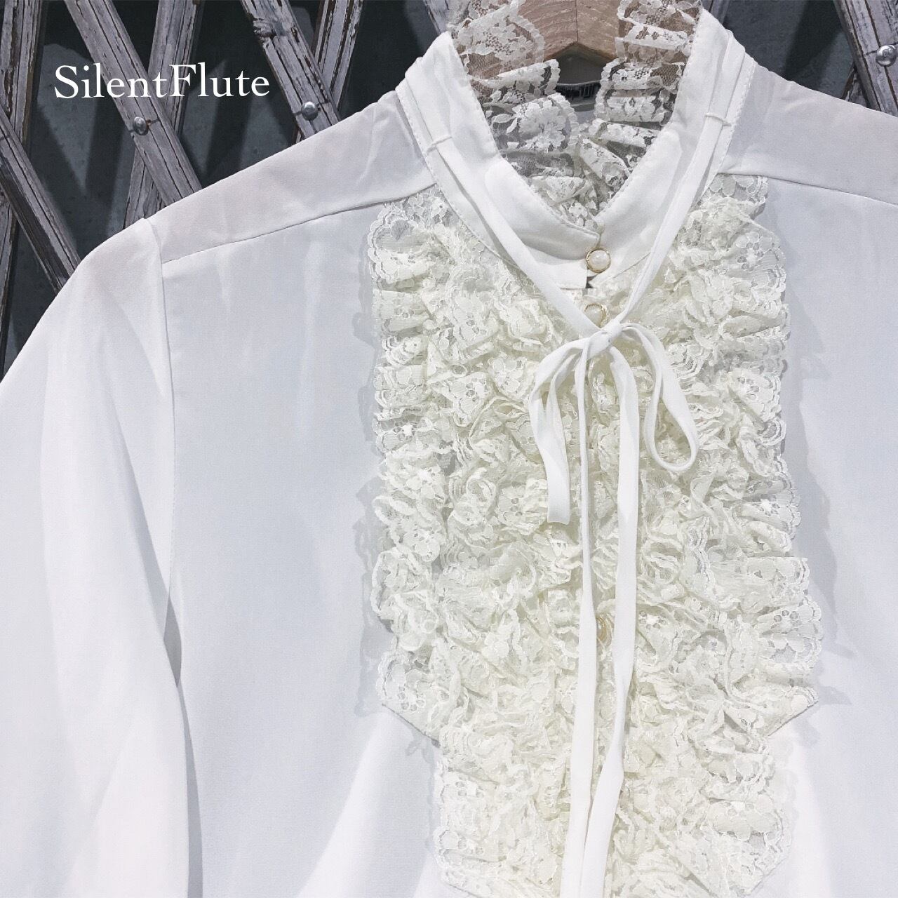 ホワイトのとろっとしたブラウスの生地にエクリュカラーのフリルは奥行もありレトロさも醸し出されます。