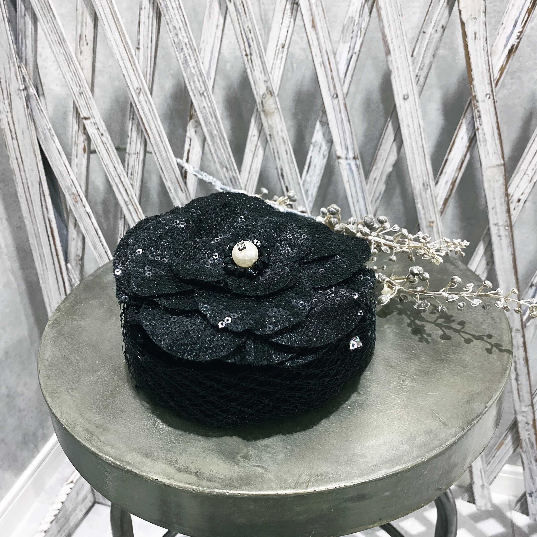 ブラックスパンコールフラワーモチーフヴィンテージトーク帽